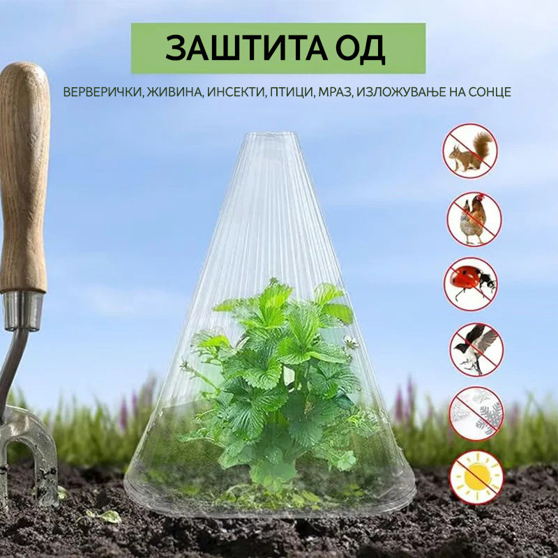 ОДЛИЧНА ЗАШТИТА – Ги штити растенијата од екстремни временски услови, животни, штетници и други закани, додека обезбедува и зимска заштита од мраз, дожд и други неповолни влијанија. Помага во создавање на заштитена средина каде што садниците можат успешно да напредуваат.